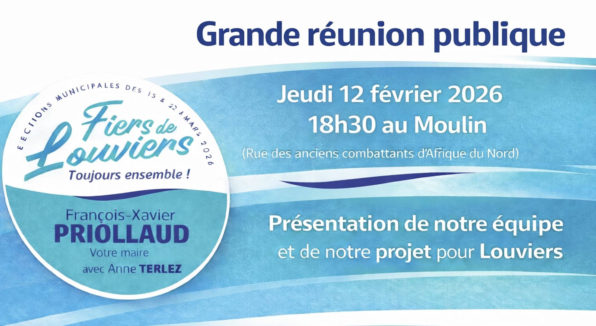Actualité • février 2, 2026 Réunion publique Réunion publique le jeudi 12 février à 18h30 au Moulin (rue des anciens combattants d’Afrique du Nord) Présentation de notre équipe et de notre projet Partager cet article Facebook X LinkedIn Copier le lien •••